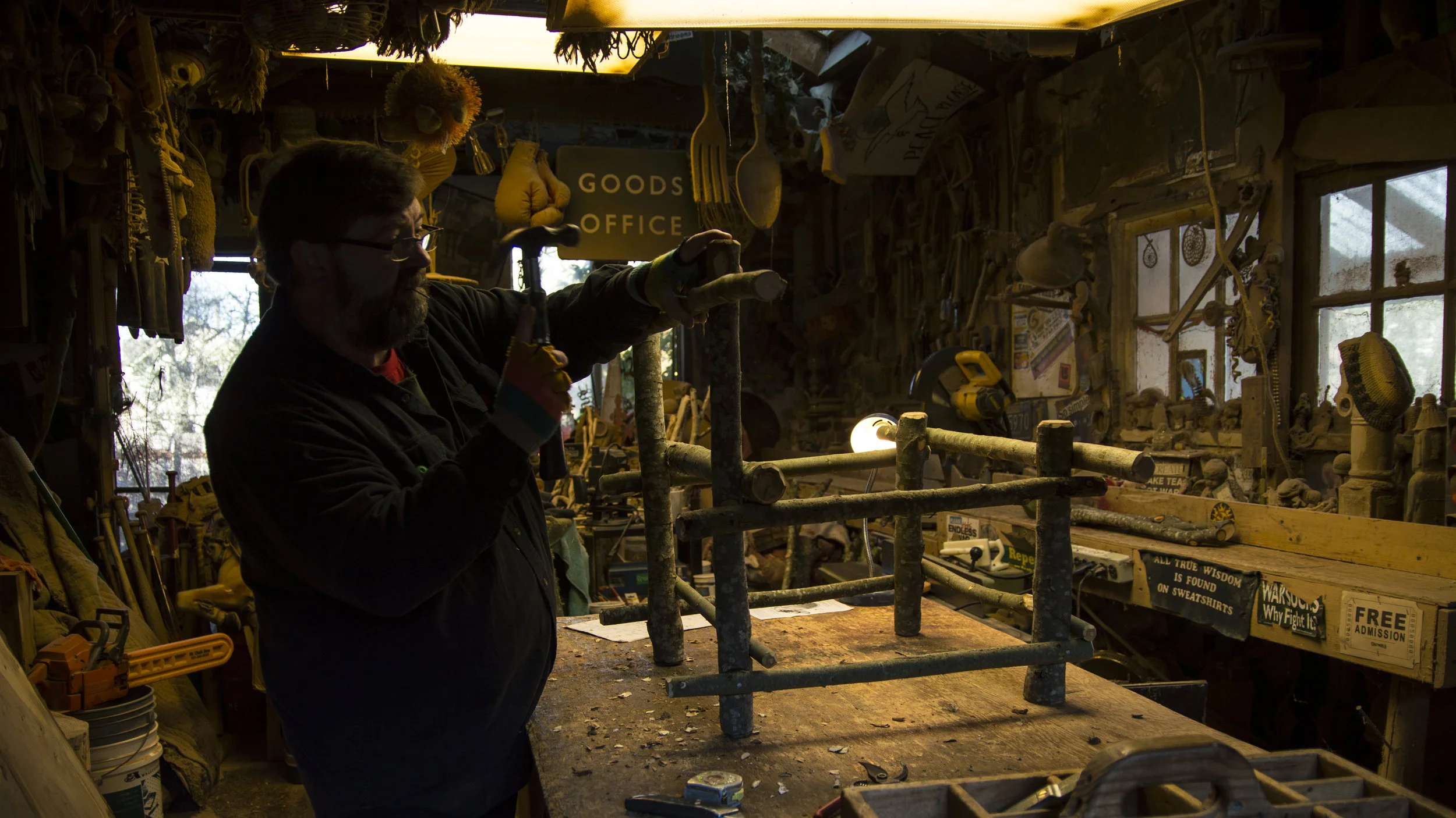 Tim Boyden is a local artist in Eugene. He specializes in taking what he finds in nature, anything from wood to old leather boots or musical instruments, and incorporating it into his art. Many of his pieces are functional furniture carved from the wood he finds but he also paints signs, carves statues and designs trinkets for the yard or around the house.